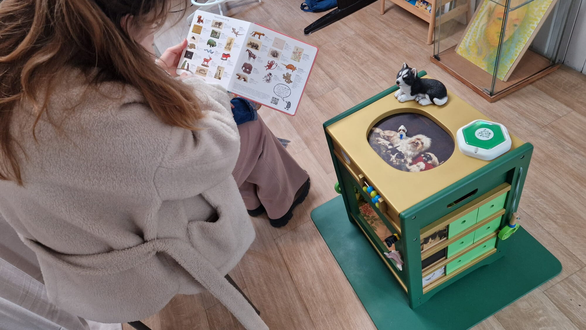 Samen met Charlotte Apers wordt het kunstwerk met zorg en aandacht geïnstalleerd in het atelier van Museumboefjes. Na overleg worden twee kunstwerken in de vitrine geplaatst – op ooghoogte van kleintjes. Zo ontstaat er een dialoog tussen het kunstwerk Apers en het Museumkastje.